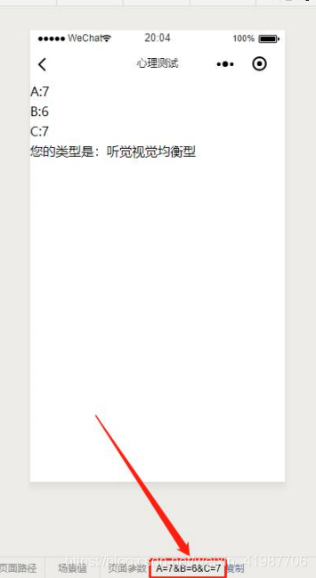 if (this.data.index == 20) {wx.redirectTo({url: '/pages/result/result?A=' + this.data.A + '&B=' + this.data.B +'&C=' + this.data.C,})} 在 result 页面的页面参数中可以看到带参跳转时的参数