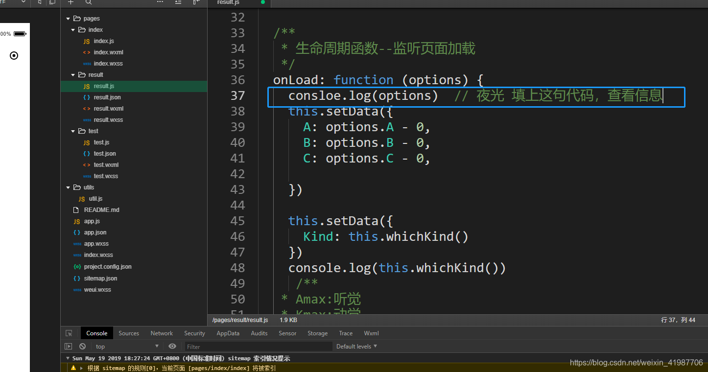 如果想用使用页面参数,可以在 result 页面的 js 文件中使用生命周期函数来获取页面参数,给生命周期函数 function()中定义一个值,这边定义为 options,即可使用 option.A 获取 A 的值,并赋值给 result 页面的变量 A,B、C 也一样。